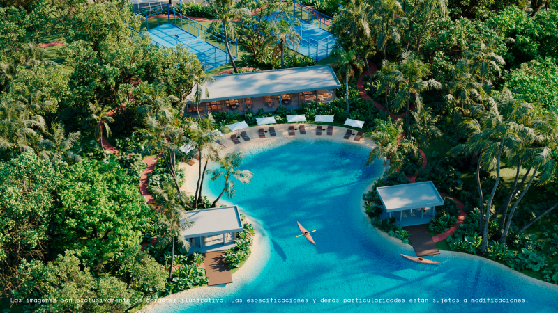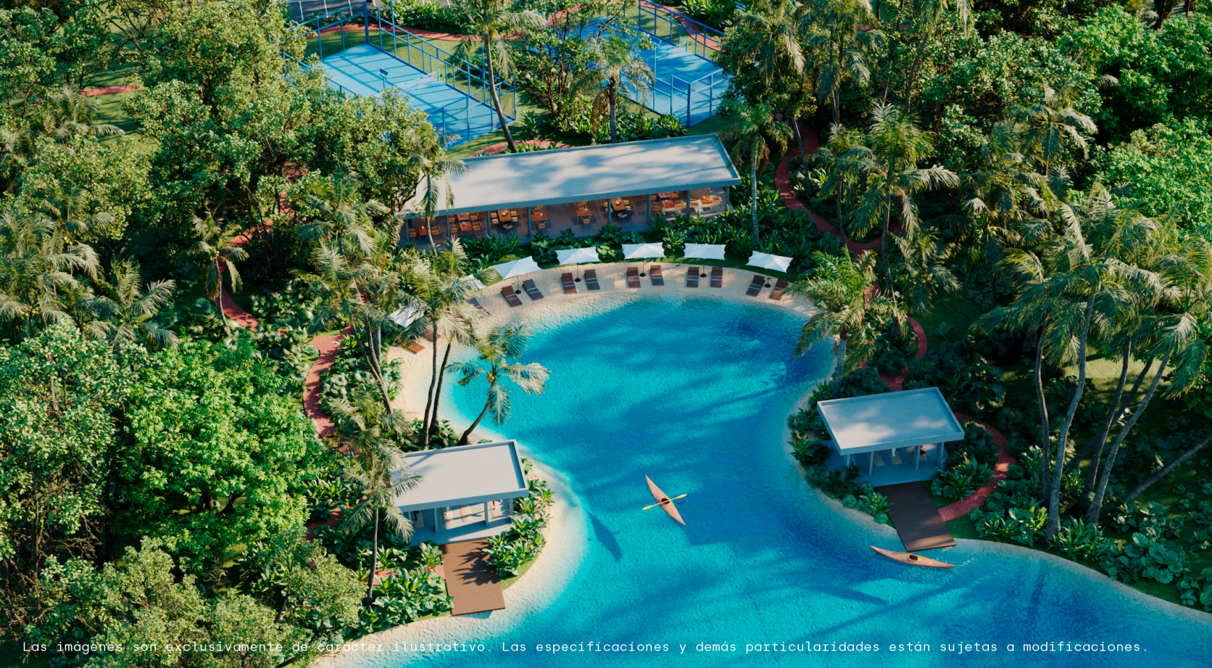 • Signature lagoon + piers, beach area, family-friendly parks, pet-park, pádel courts, house club, gym and cowork areas.